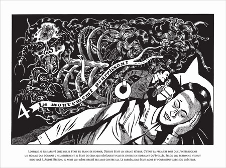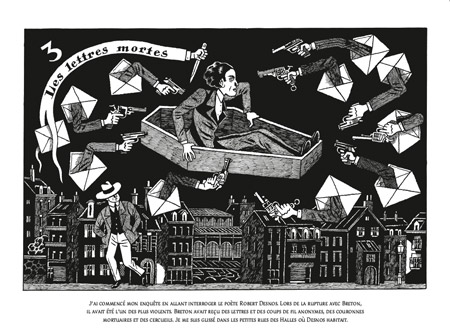 Enquanto a investigação de Nick Carter apenas sugere a busca pelo maravilhoso, há muitas referências à vida de Breton e ao surrealismo, tanto no texto quanto nos incríveis painéis criados por David B., que os fãs do movimento artístico se deliciarão em descobrir. Leitura divertida e instrutiva, vamos passear nos sonhos de Robert Desnos, visitar Nadja em um hospício, nos deparar com vilões fictícios do universo de Carter, como o doutor Quartz, e saber das desavenças com Salvador Dalí e Gala, sua companheira e ex-esposa de Paul Éluard. Além disso, a investigação explora a relação com outros nomes incontornáveis do movimento, como Louis Aragon, René Crevel, George Bataille e René Magritte, sem falar em personagens que frequentavam a turma, como Leon Trotsky e Frida Kahlo.